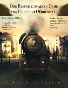 Sie sind herzlich eigeladen zu unseren Aufführungen am Freitag, dem 14. November um 19 Uhr, und am Sonntag, dem 16. November um 19 Uhr. Die 12. Klasse inszeniert Dürrenmatts Tragikomödie „Der Besuch der alten Dame“. Das Stück wird einige interessante Fragen an die Zuschauer und Zuschauerinnen stellen.