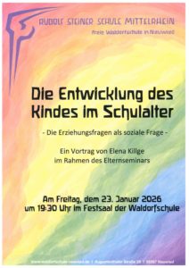 Am Freitag um 19:30 Uhr erwartet Sie ein Vortrag von Elena Killge über “Die Entwicklung des Kindes im Schulalter” im Festsaal der Schule.